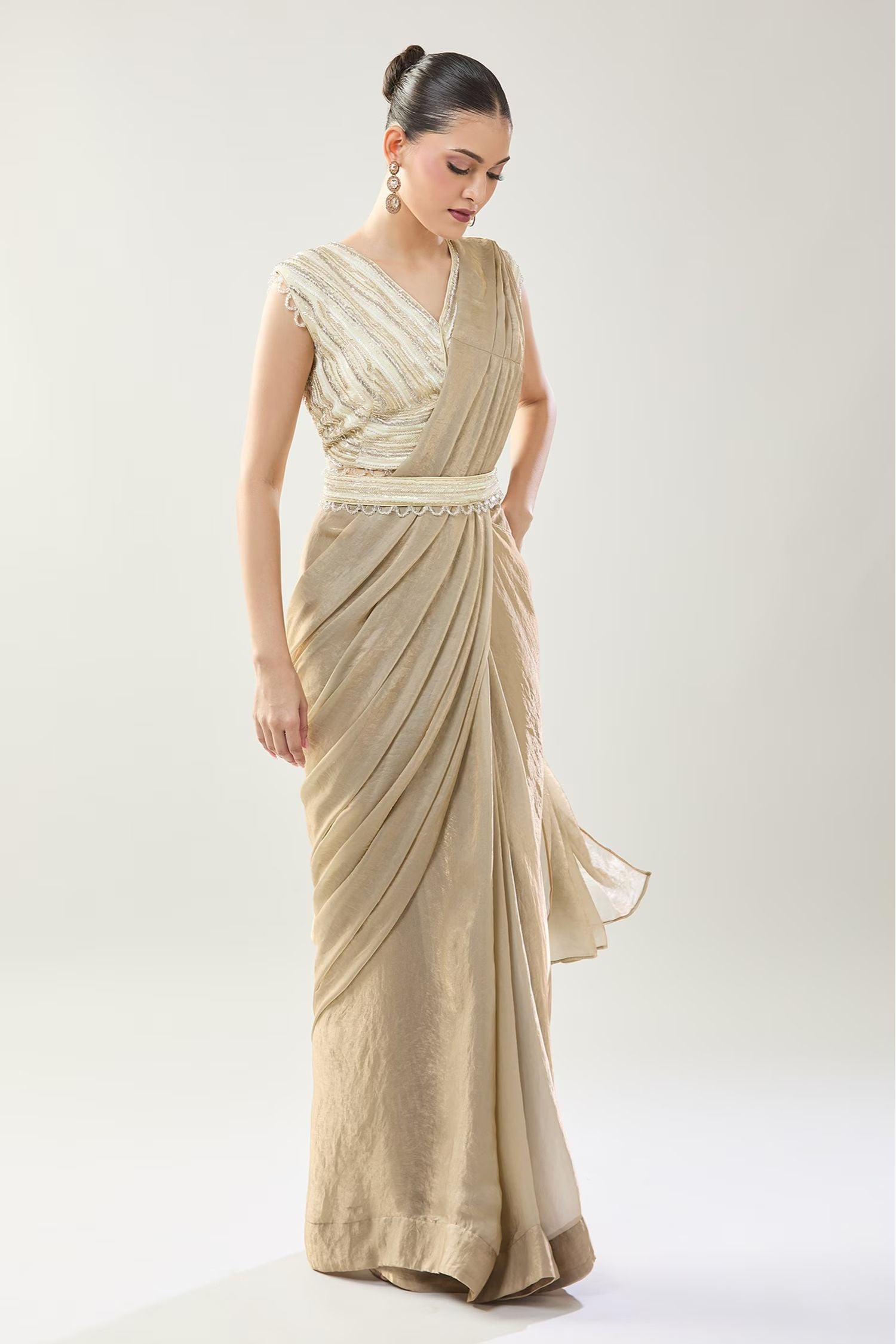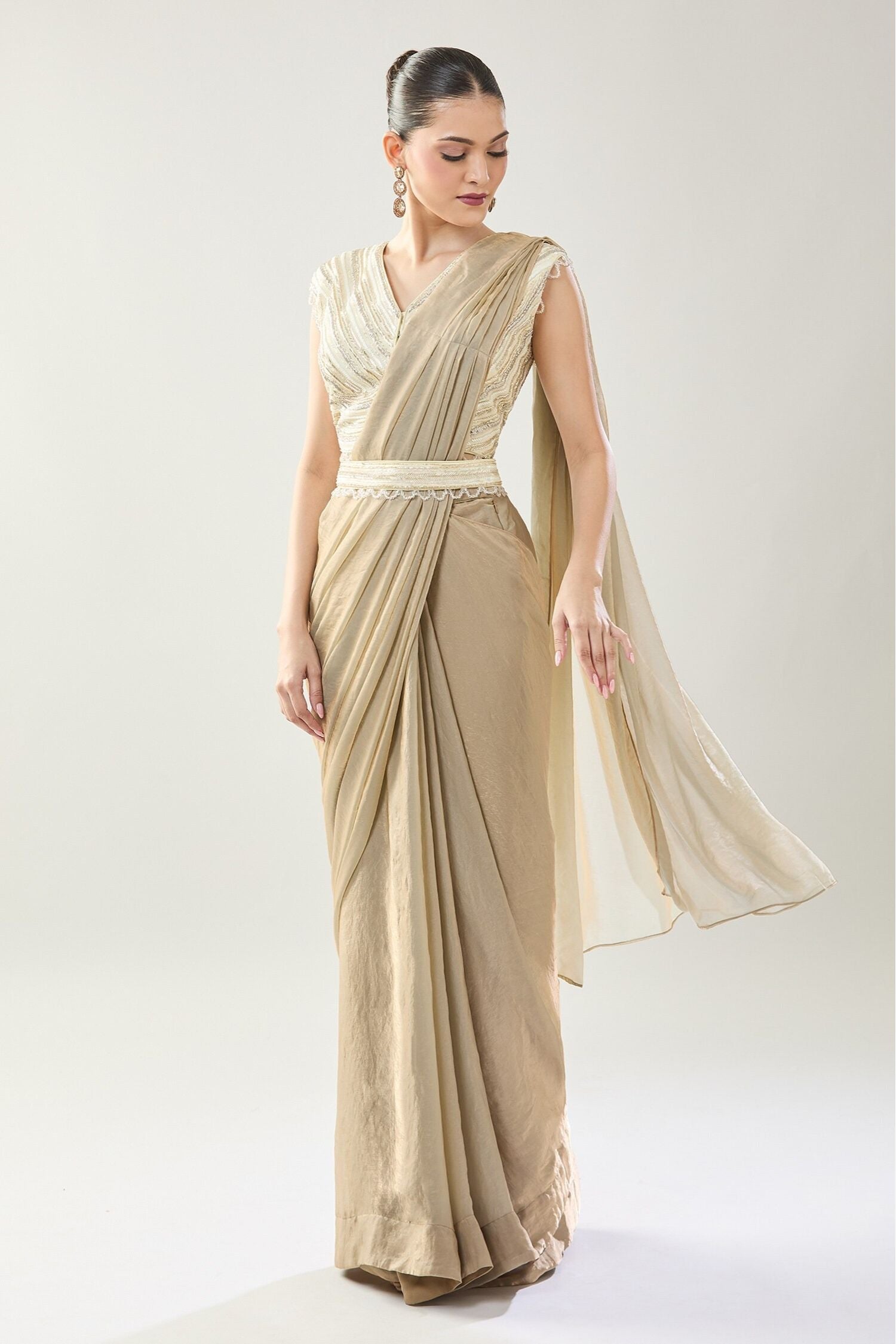 Crafted from premium Diamond Silk, the Beige Diamond Silk V-neck Embellished Pre-draped Saree Set combines traditional elegance with modern ease. Featuring a sophisticated V-neck blouse enhanced with delicate embellishments, this pre-draped saree offers a flawless silhouette without the complexity of manual draping. Its neutral beige tone adds versatility, making it suitable for formal occasions and celebrations while ensuring comfort and style throughout the day.