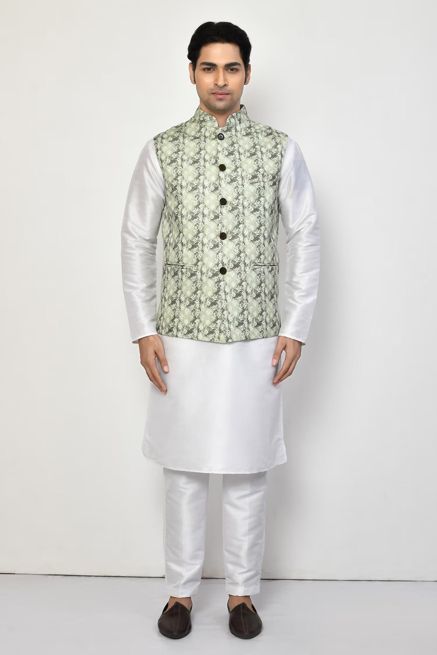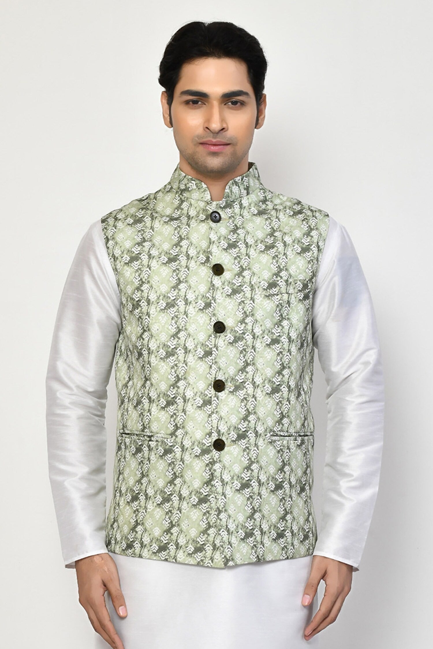 This designer jacket in green is made from a premium silk blend, offering a smooth texture and subtle shine. Tailored for a sharp, sophisticated fit, it provides both comfort and elegance. Perfect for formal occasions, the jacket’s rich green color adds a unique and stylish statement to your ensemble.