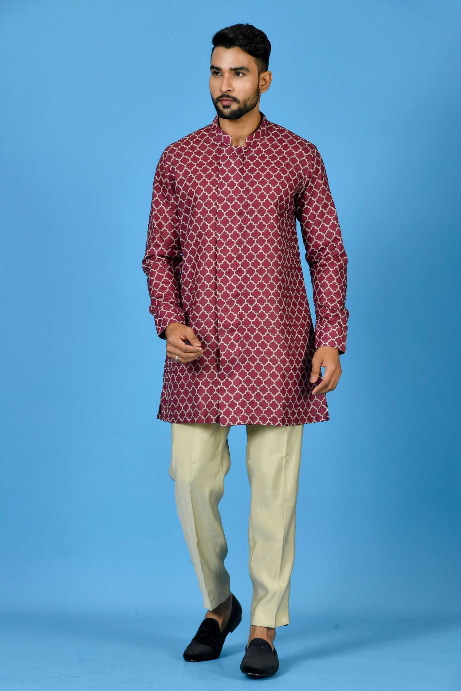 This maroon designer short kurta is made from a breathable cotton blend, combining comfort with durability. Its tailored fit offers a sleek silhouette suitable for both casual and festive occasions. The rich maroon hue adds a sophisticated touch, making it an elegant addition to any ethnic wardrobe.