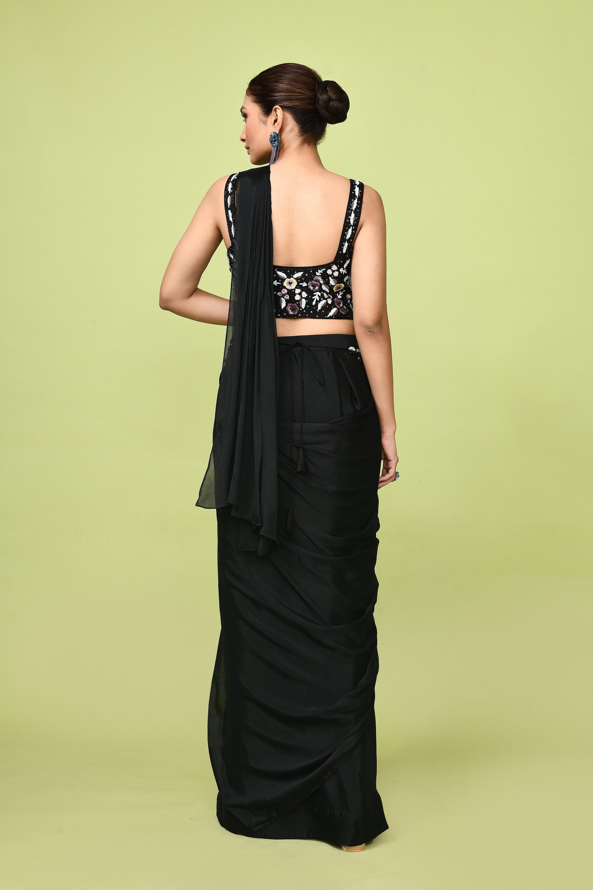This Designer Wear Black Chinon Chiffon Drape Saree combines elegance and comfort with its lightweight, flowing fabric. The chiffon drape ensures graceful movement, while the accompanying crepe blouse features intricate embroidery and a flattering sweetheart neckline for a refined silhouette. Ideal for formal occasions, this saree offers a sophisticated look that balances modern style with traditional charm.