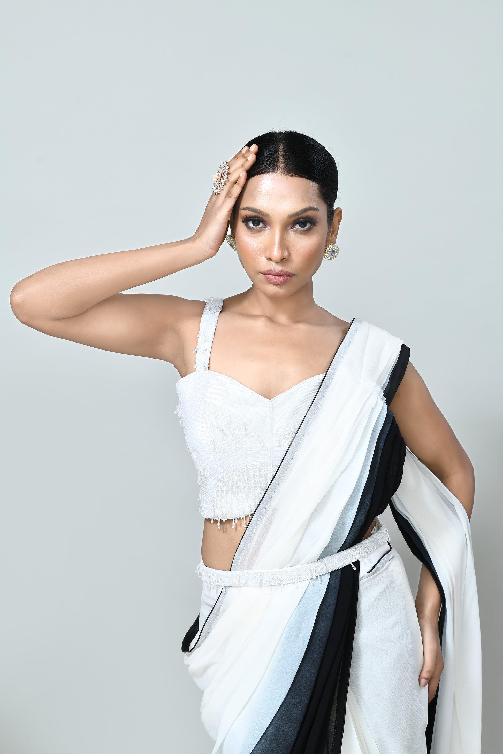 This Designer Wear Black & White Georgette Drape Saree combines elegance with intricate craftsmanship. The lightweight georgette fabric ensures a fluid drape, while the delicate net embroidery adds sophisticated detail. Complemented by a sweetheart neck blouse, this ensemble offers a modern silhouette with traditional charm. Perfectly suited for formal occasions, it delivers both style and comfort with expert precision.