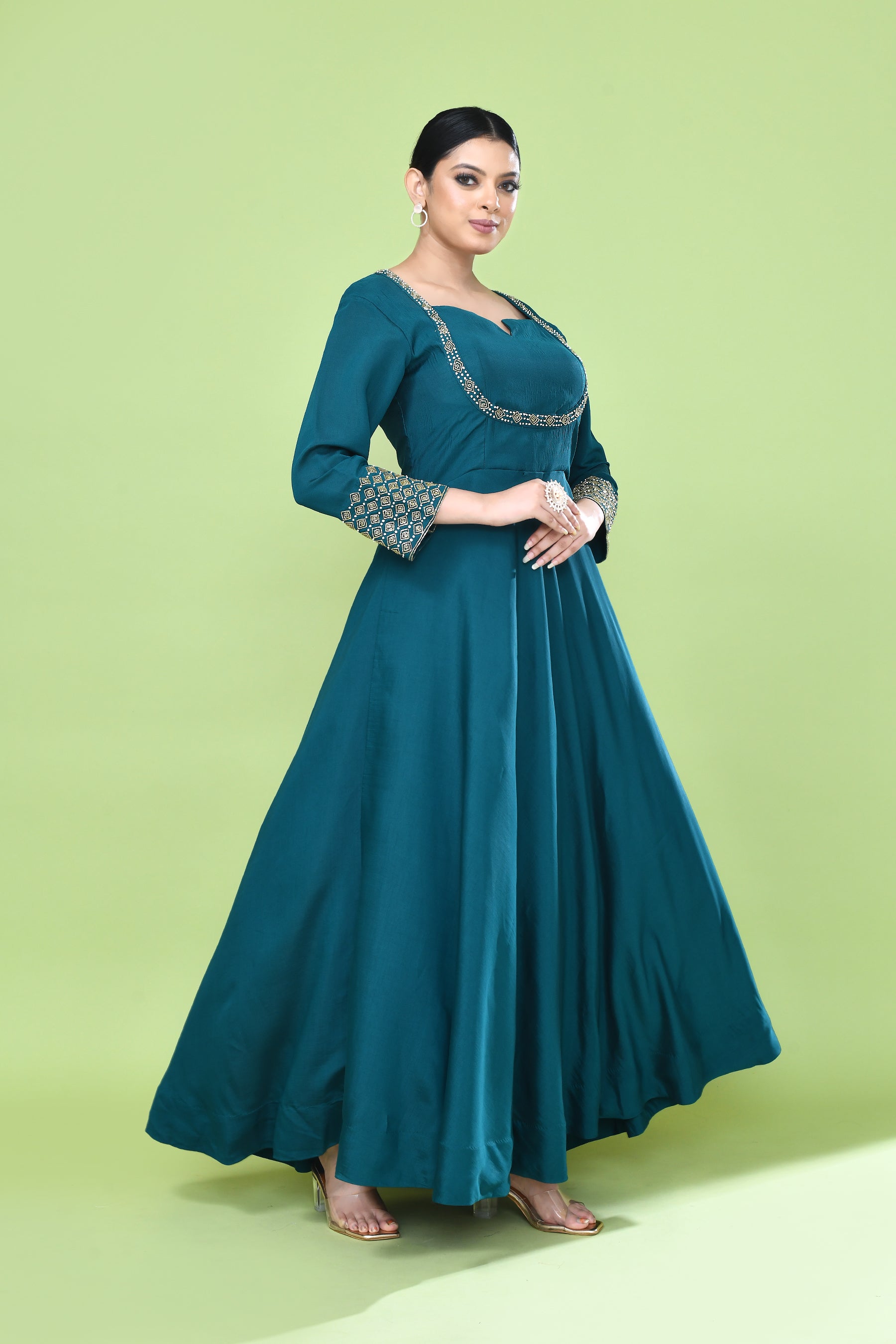 This Designer Green Gown features a beautifully embroidered sweetheart neckline, lending a touch of refined elegance. The three-quarter sleeves add sophistication while ensuring comfort and ease of movement. Expertly crafted for a graceful fit, this gown is an excellent choice for formal occasions, combining classic appeal with detailed artistry.