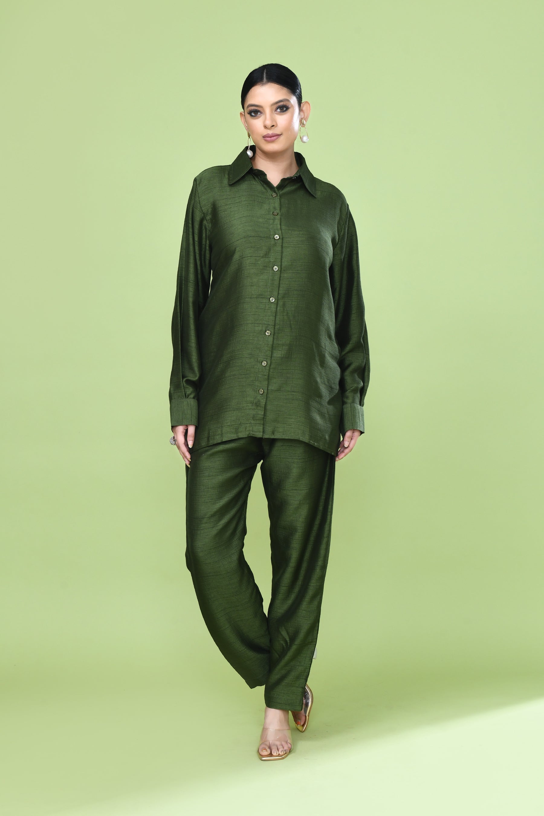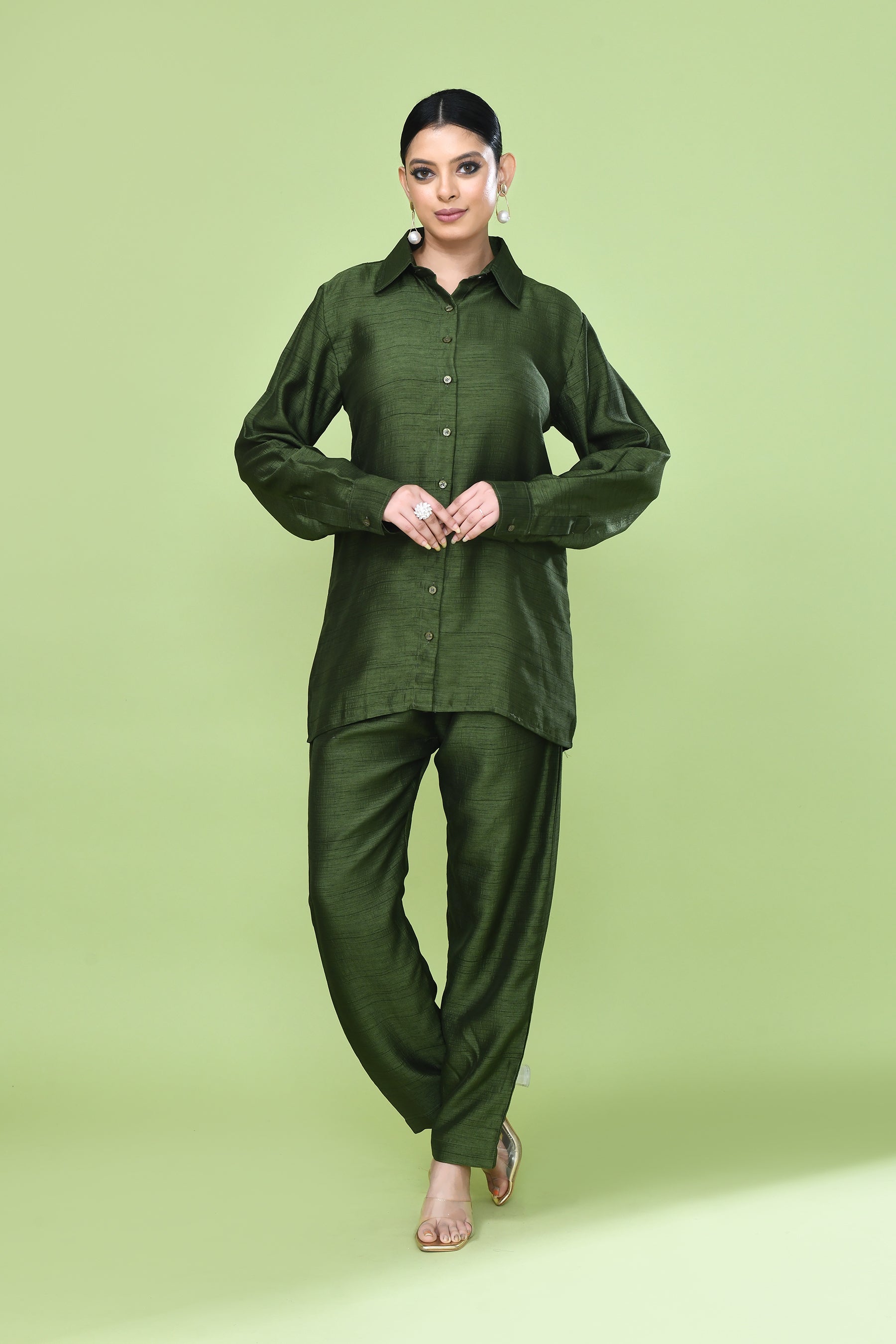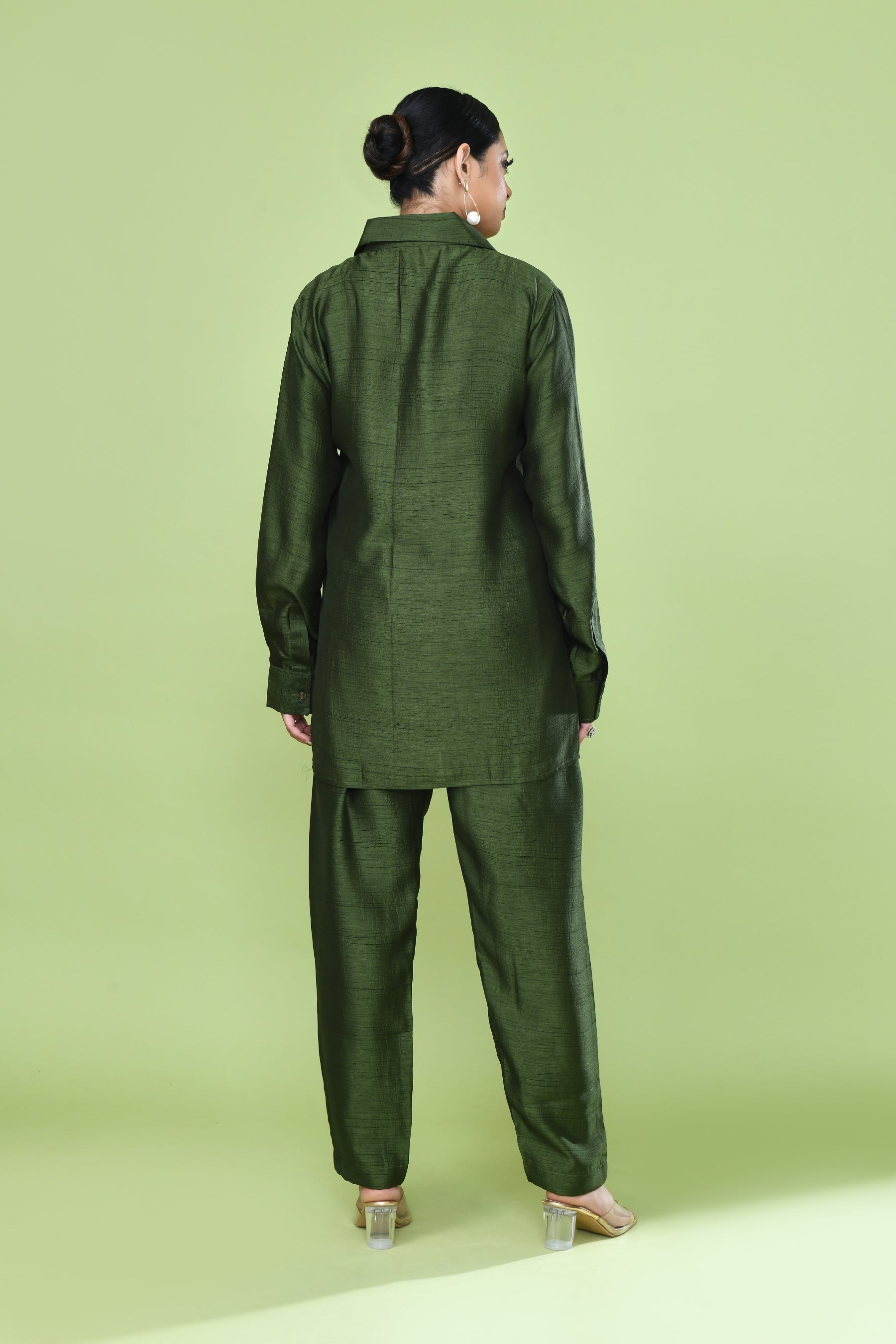 The Designer Wear Green Silk Co-Ord Set showcases a luxurious longline shirt paired with relaxed pants, crafted from high-quality silk fabric. This ensemble offers a sophisticated blend of comfort and style, with the flowing shirt silhouette complementing the easy-fit trousers. Ideal for formal occasions, the verdant green hue enhances your elegance while maintaining a contemporary edge.