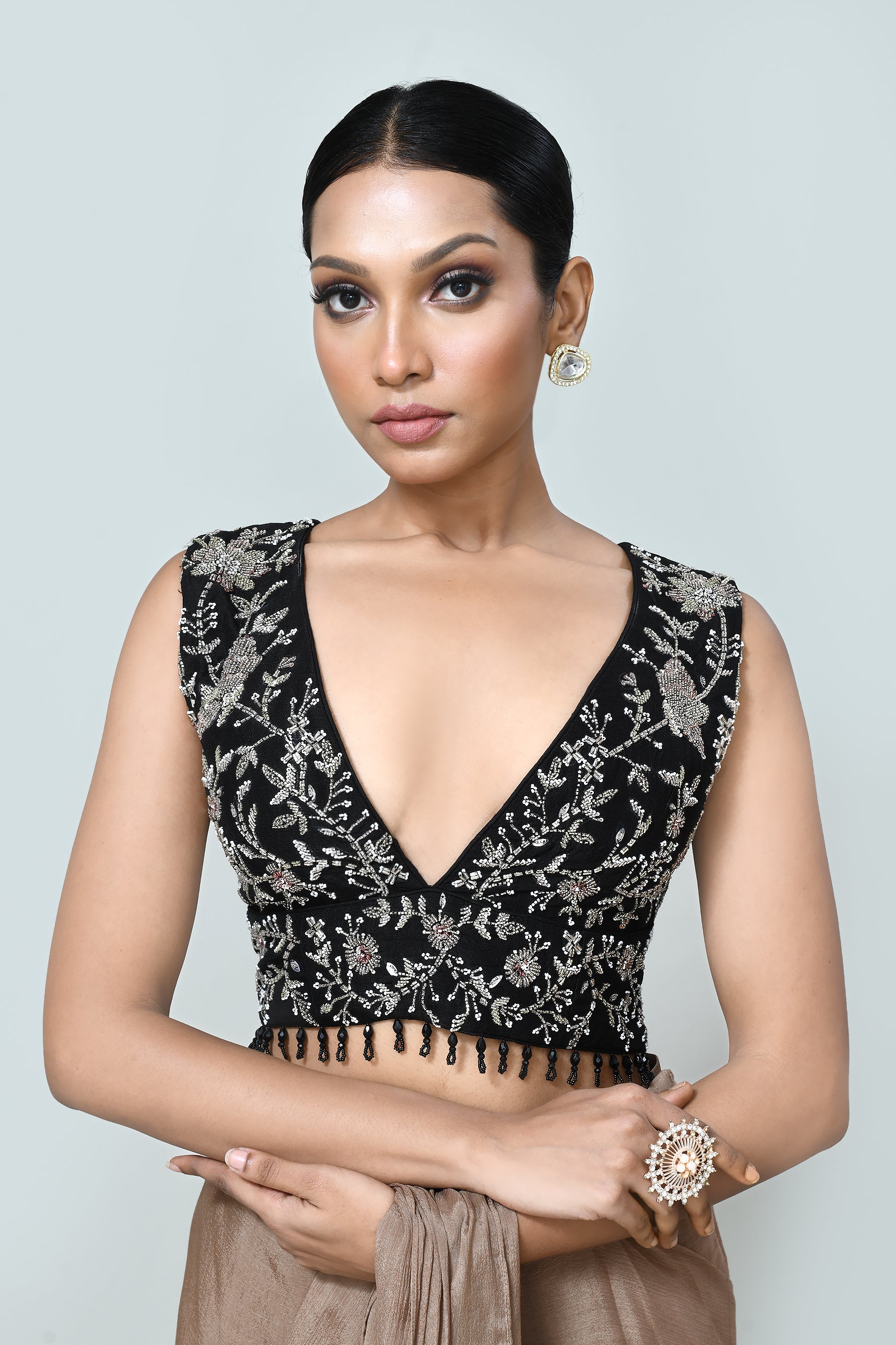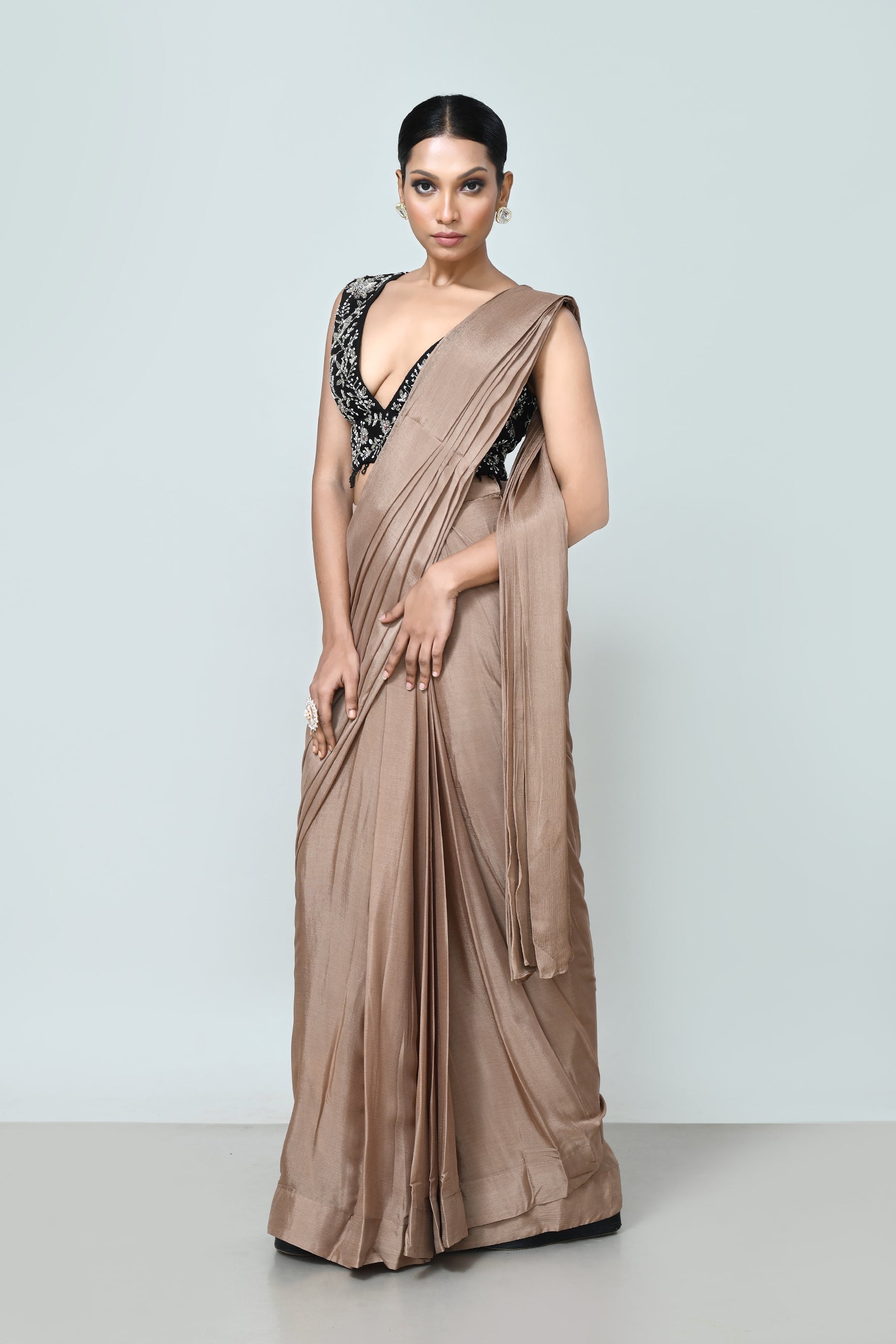 This Designer Wear Brown Chinon Chiffon Saree features a luxurious drape that enhances your silhouette with effortless elegance. Paired with a crepe blouse detailed with intricate embroidery and a sophisticated V-neck design, this ensemble combines refined craftsmanship with contemporary style, perfect for special occasions demanding a touch of understated glamour.