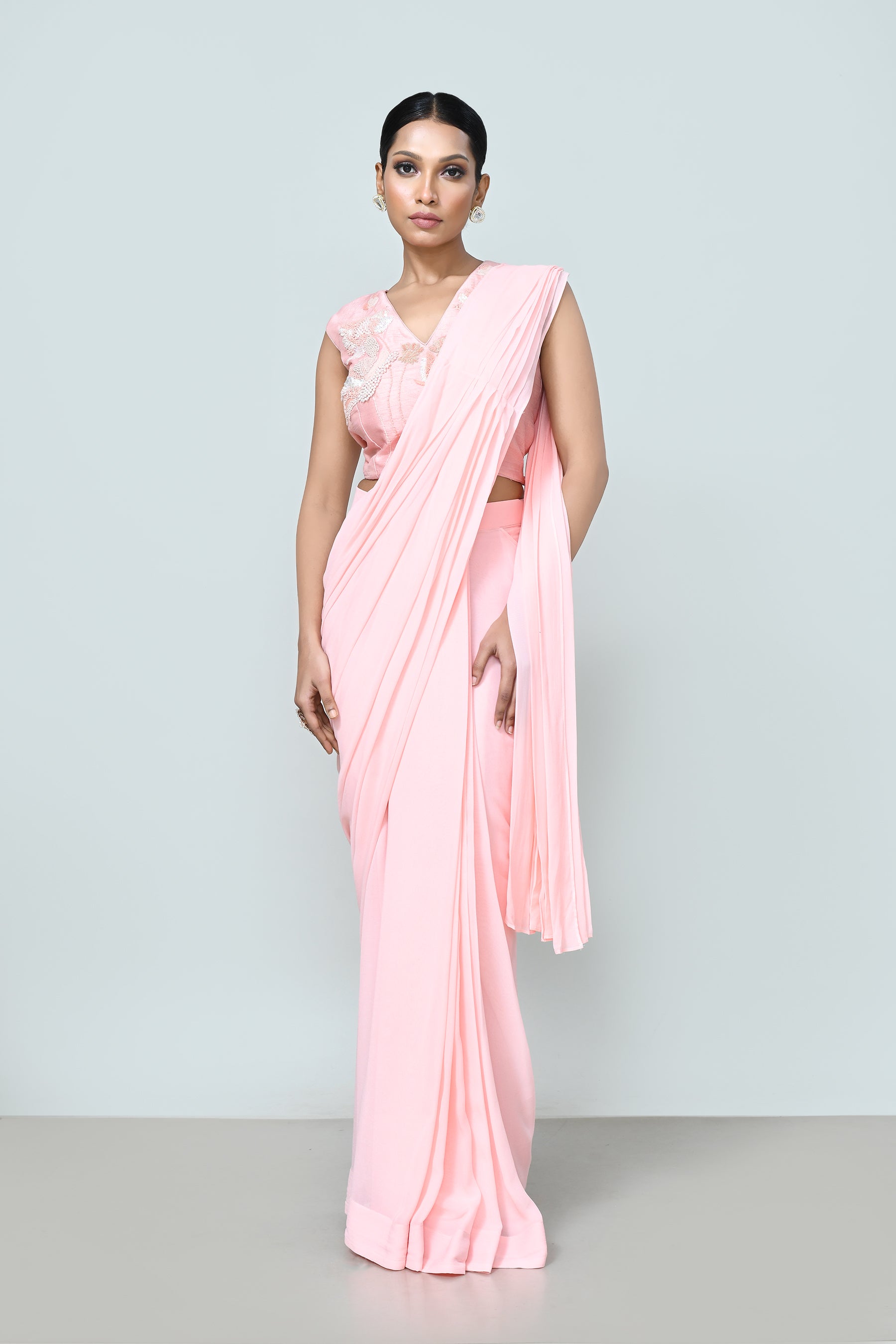 This designer light pink georgette saree offers an elegant drape that enhances your silhouette with effortless grace. Paired with a silk embroidered V-neck blouse, it combines delicate craftsmanship and luxurious textures for a refined, sophisticated look. Ideal for formal occasions, this ensemble ensures both comfort and style, reflecting expert design and attention to detail.
