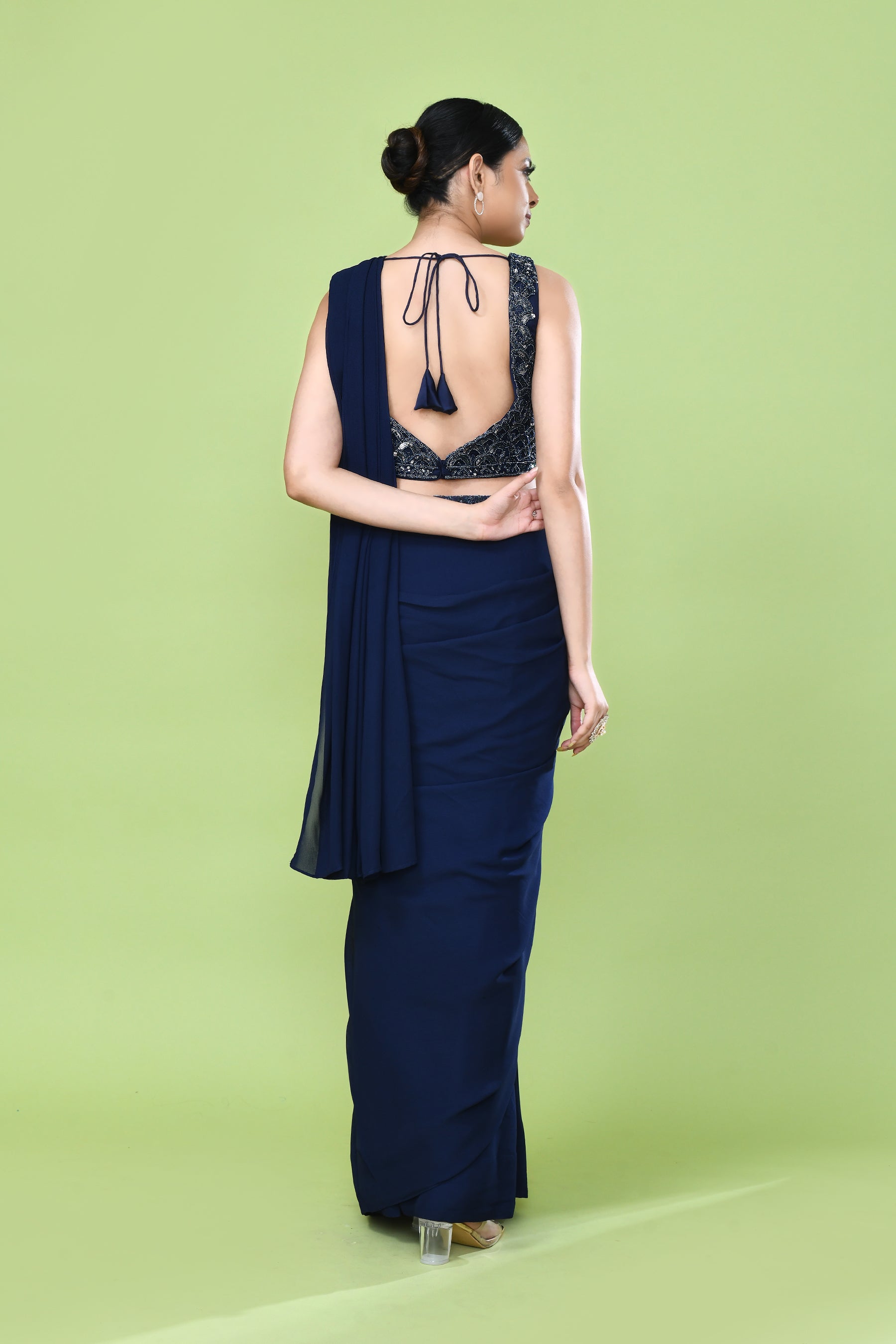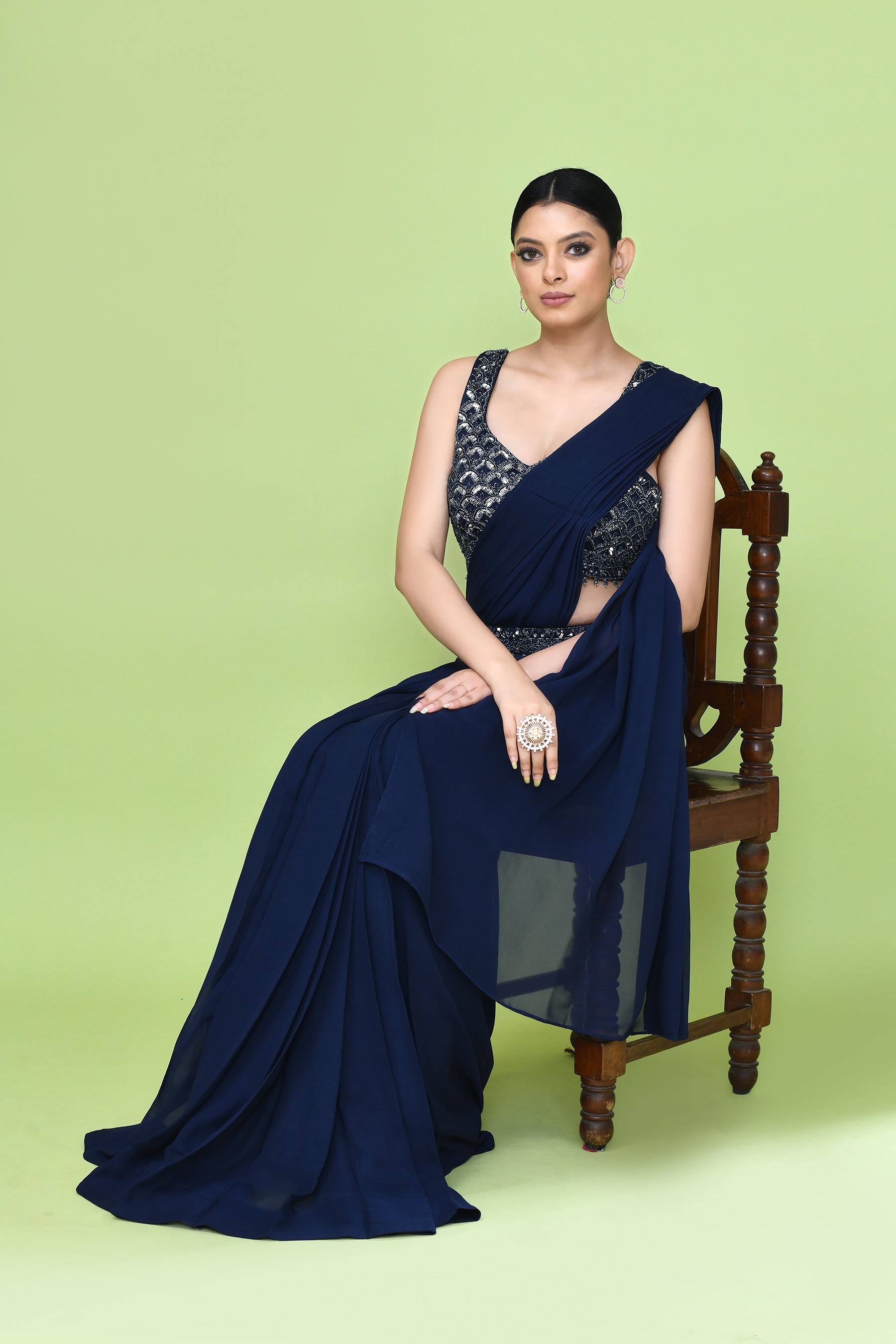 This designer navy blue georgette saree features a fluid drape that enhances grace and movement. It comes with a net blouse detailed with delicate embroidery and a flattering V-neck design, perfect for sophisticated occasions. Lightweight and elegant, this ensemble combines traditional craftsmanship with modern style, making it ideal for formal gatherings and celebrations.