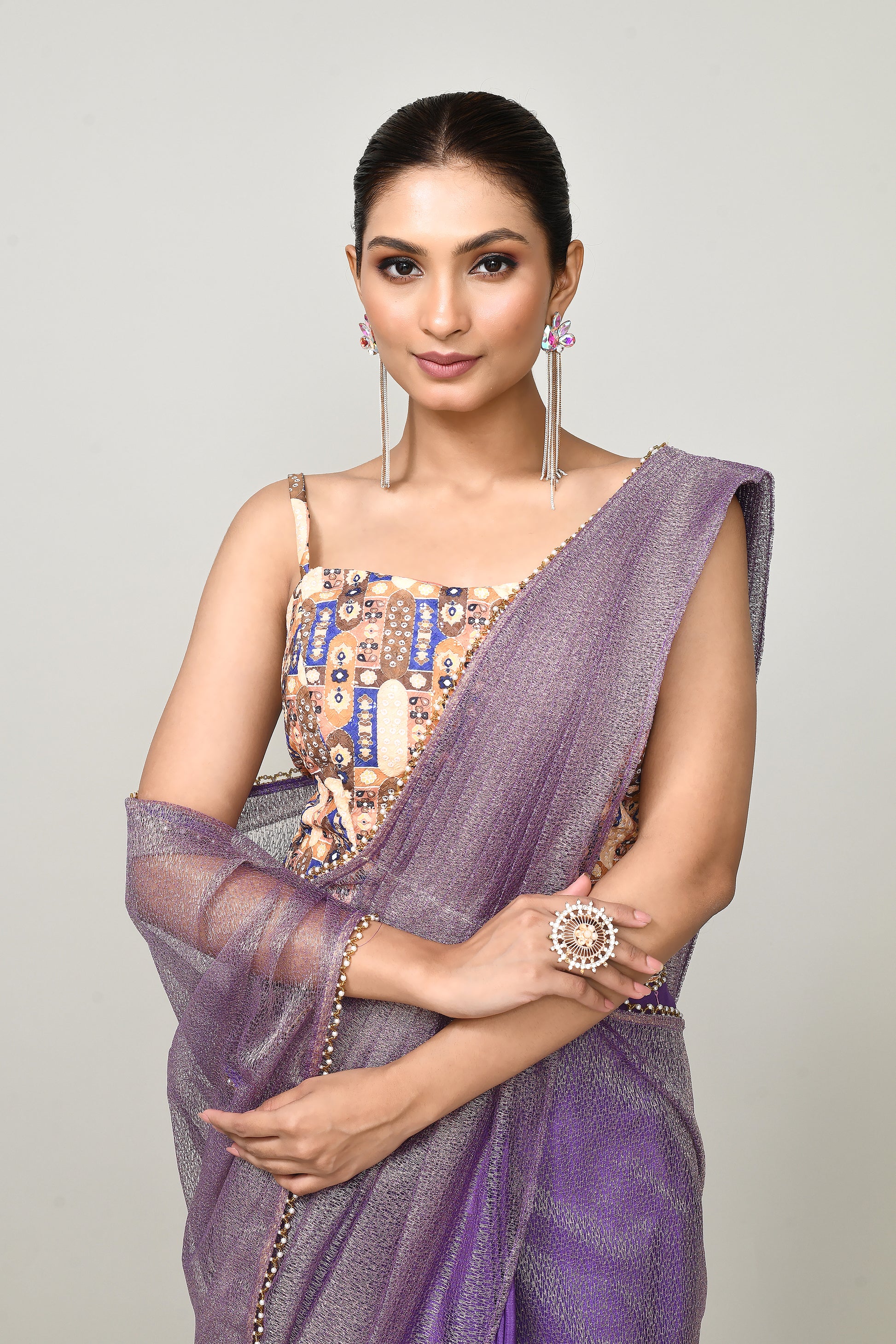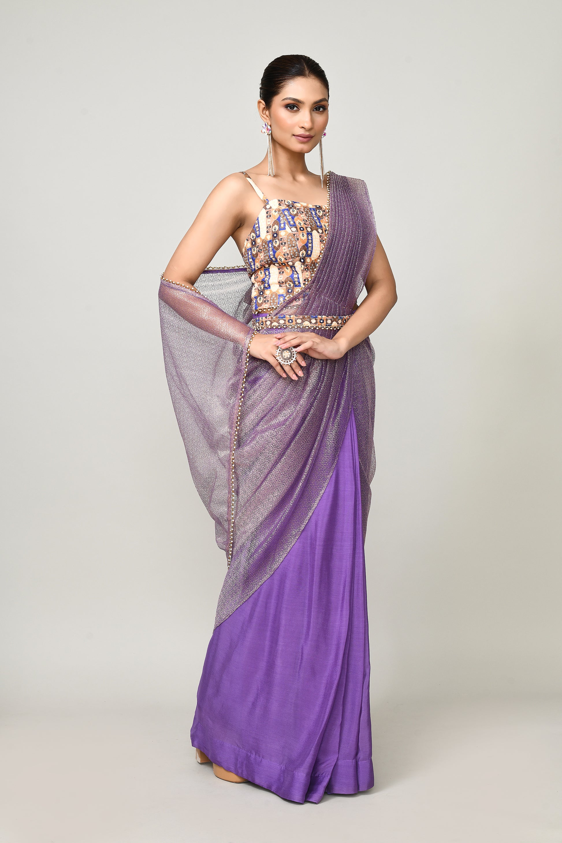 This designer purple saree features a sophisticated blend of Chinon chiffon and tissue fabric, offering a lightweight yet elegant drape. The combination enhances fluidity and sheen, creating a striking appearance for special occasions. Complemented by a tailored round neck blouse, it ensures a modern and polished look that reflects expert craftsmanship and style.