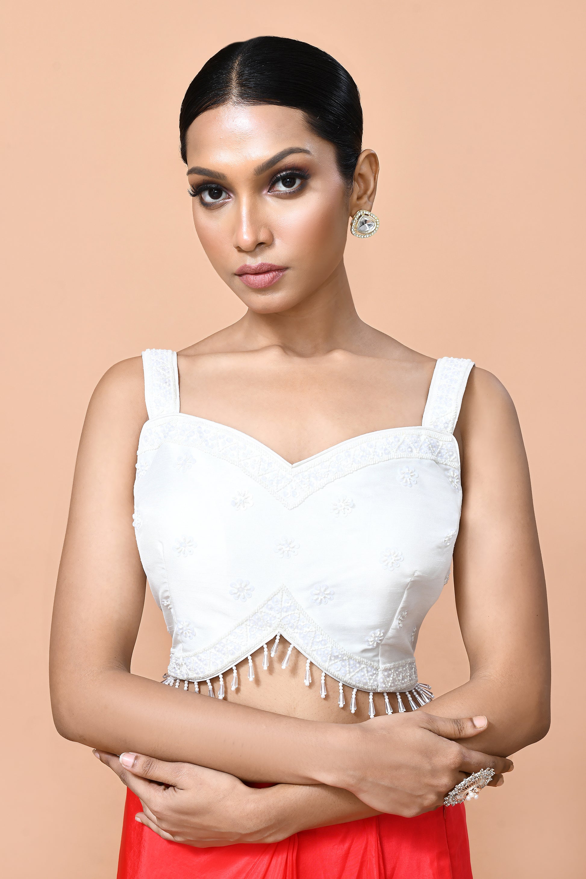 This Designer Wear Red Drape Saree features a delicate viscose organza fabric that offers a lightweight and elegant flow. Paired with a silk blouse designed with a flattering sweetheart neckline, the set balances traditional charm with refined sophistication. Ideal for festive occasions or formal events, it combines luxurious materials and expert tailoring for a graceful, poised appearance.