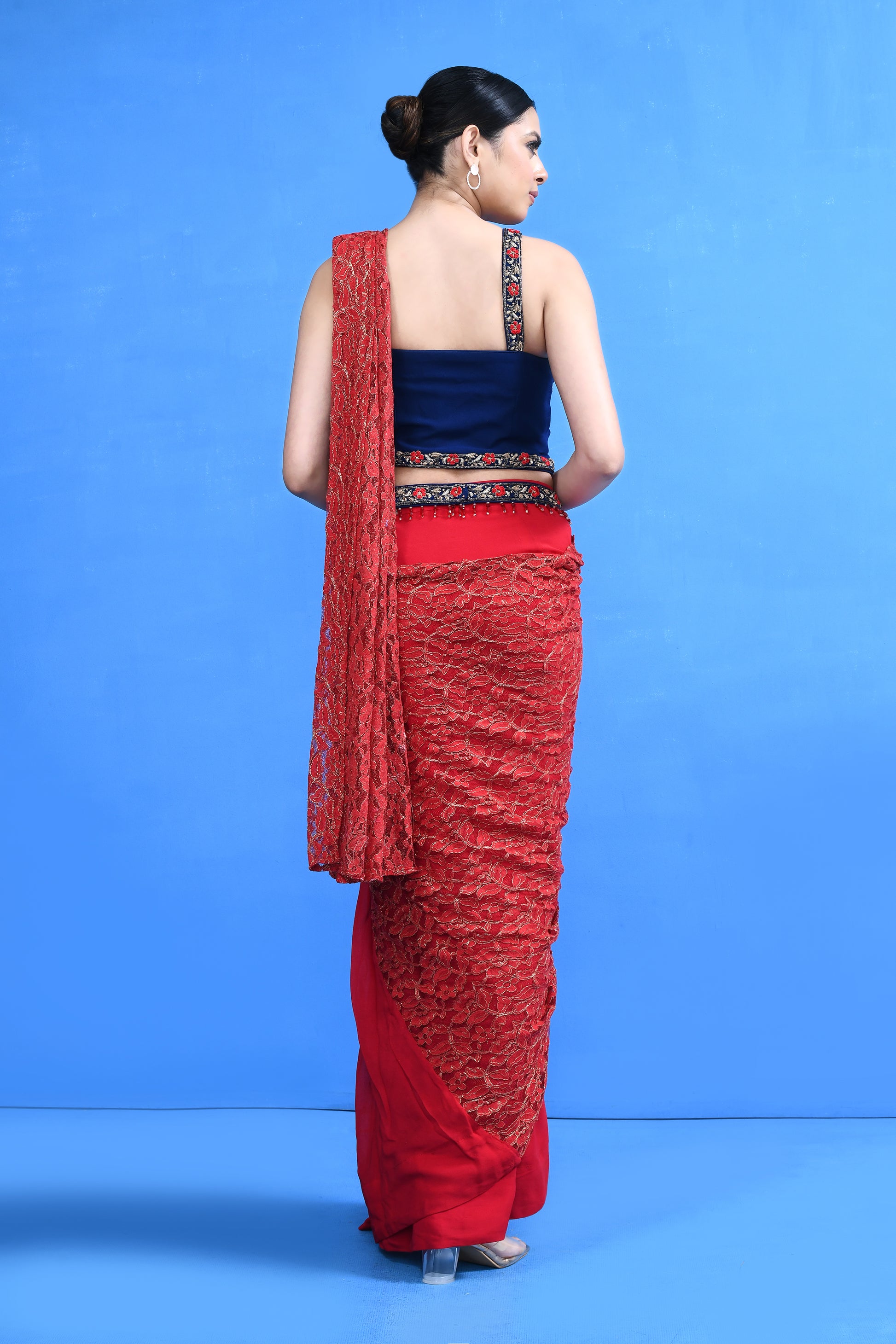This designer Red Georgette saree is crafted with a graceful drape accentuated by delicate center lace detailing, enhancing its sophisticated appeal. Complemented by a blue georgette net blouse featuring intricate embroidery and a flattering sweetheart neckline, this set melds elegance with modern refinement. Perfectly tailored for comfort and style, it is an excellent choice for weddings, celebrations, and special occasions.