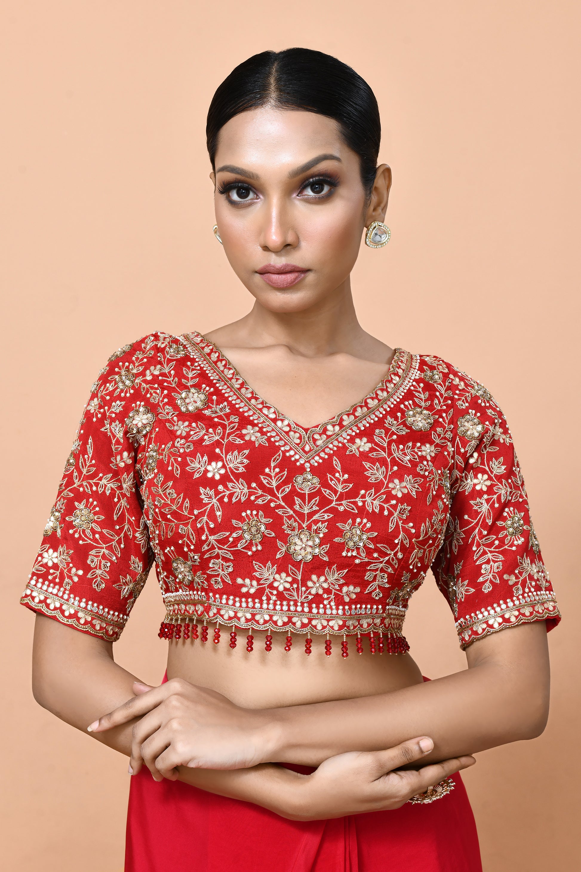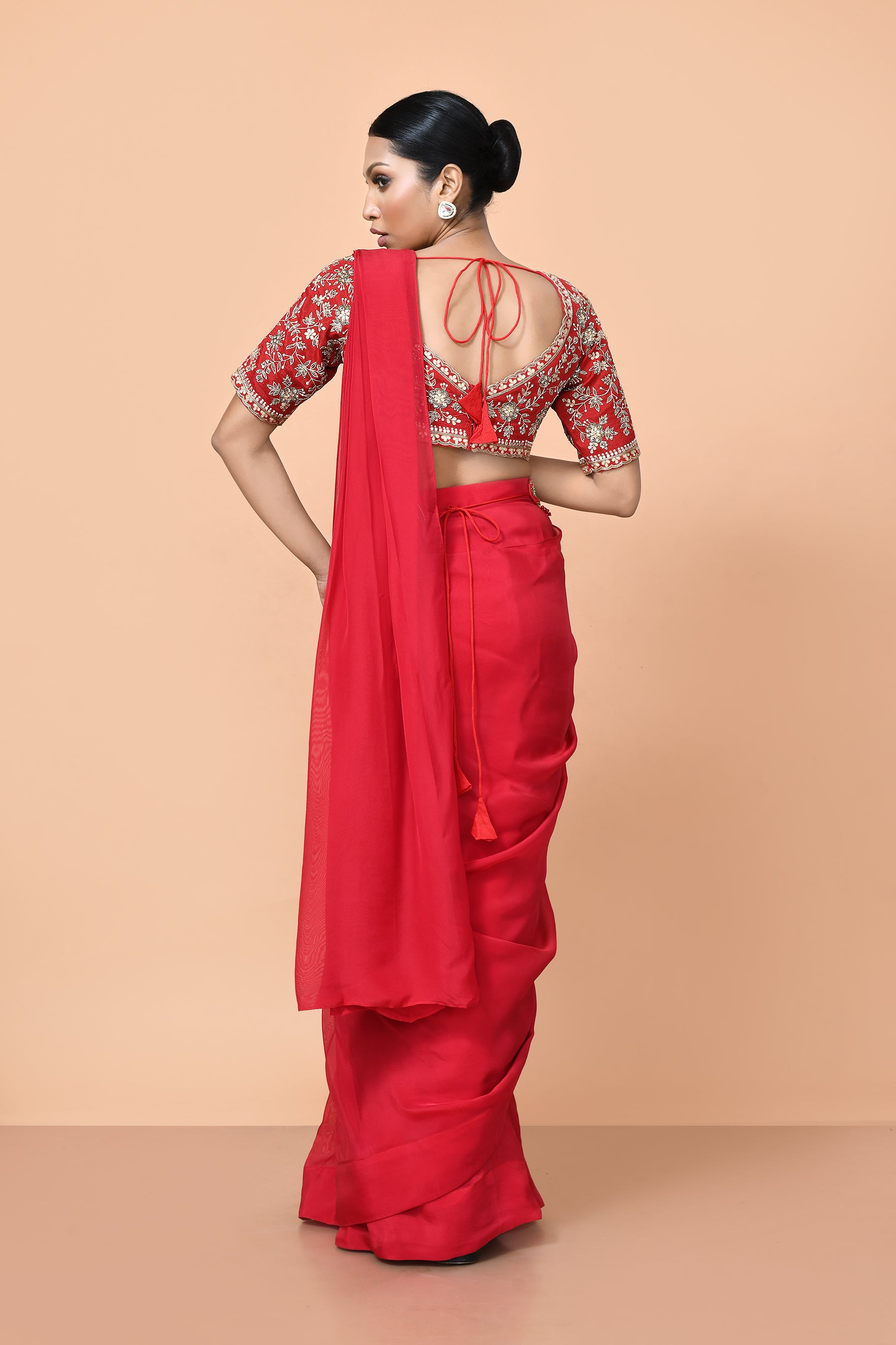 This Designer Wear Red Viscose Organza Saree features a delicate organza drape in a vibrant red shade, crafted from lightweight viscose for graceful flow and comfort. Paired with a sophisticated V-neck blouse, it offers an elegant silhouette perfect for formal events and celebrations. The combination of sheer texture and vivid color creates a timeless yet modern attire that enhances your presence with subtle refinement.