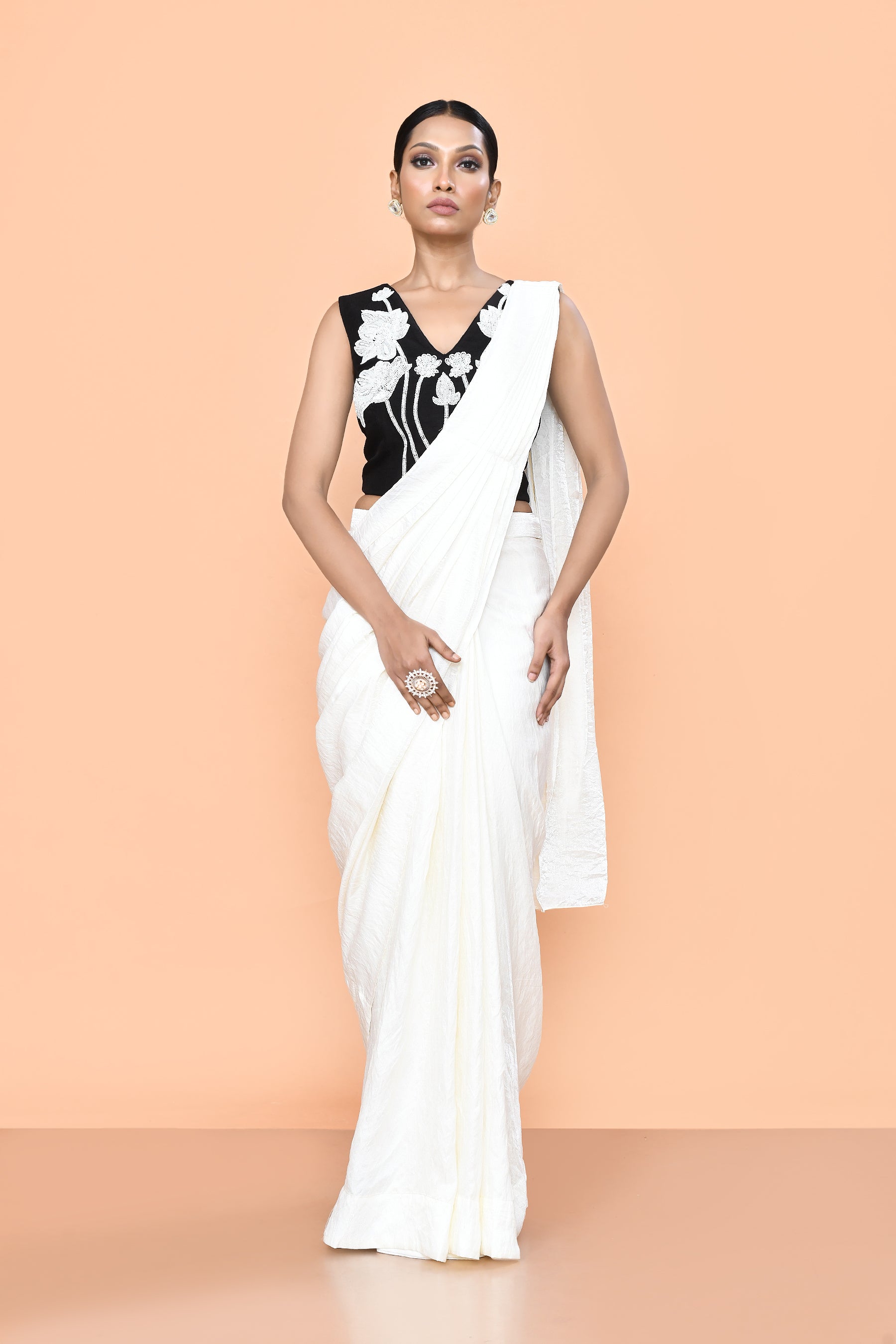 This Designer Wear White Drape Saree Set features a sophisticated blend of Chinon chiffon and Nova silk, offering a lightweight yet luxurious drape. The accompanying blouse is crafted from silk and adorned with detailed embroidery, complementing the saree with a refined V-neck silhouette. Ideal for formal occasions, this ensemble balances traditional elegance with contemporary design precision.